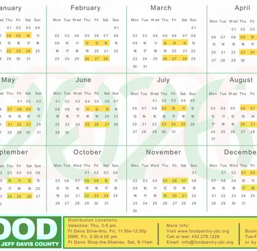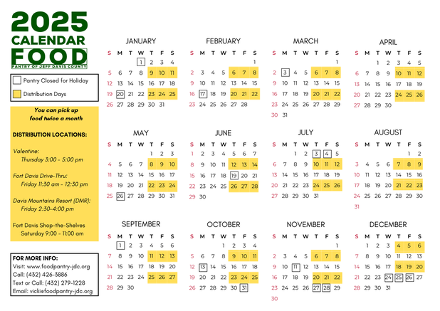 Since 1998, the Food Pantry of Jeff Davis County has been offering supplemental food to 10-20% of the families in the county.